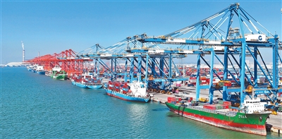 图为11月29日,货轮在广西钦州港码头装卸集装箱。