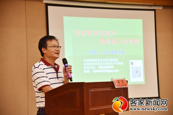 当天,赣州市农民专业合作社联合会百香果分会(以下简称“百香果分会”)成立。台湾南投县农业联合社主席吴记应邀前来分享“百香果实用高产栽培技术与管理”。