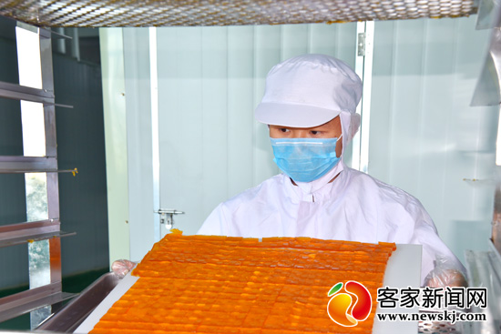 江西果然食品有限公司工作人员将烘干的百香果糕上架。